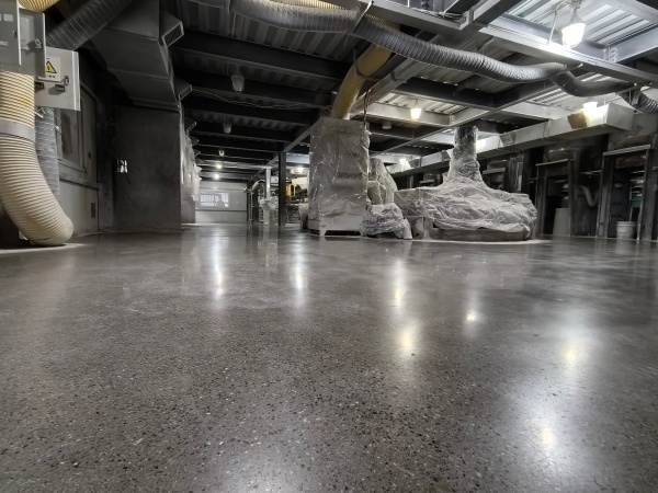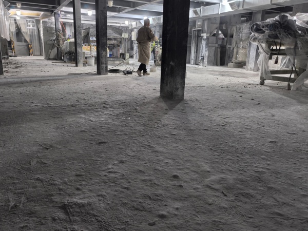 车间从满布粉尘、质感粗糙的水泥地面,如今已蜕变为高光亮面、耐磨抗渗的固化剂地坪。