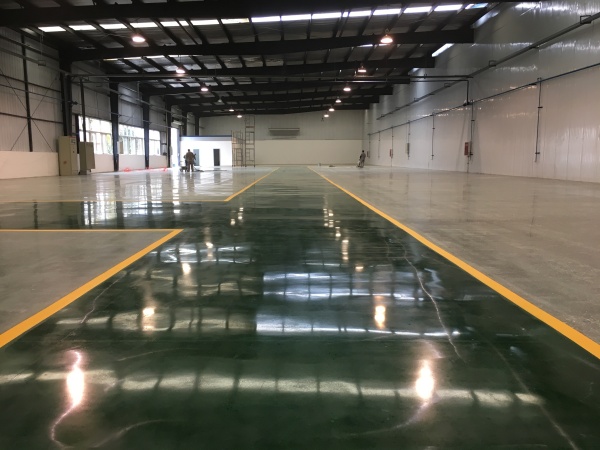 项目初期,车间地面存在起灰、磨损、污渍残留等问题,无法满足汽车生产的高耐磨、抗重载需求。我们先对原地面进行打磨、修补,通过固 化剂渗透与混凝土发生结晶反应,从内部提升地面硬度与密实度。针对车间功能分区需求,我们还在核心通道区域施工了绿色固化剂地坪,并搭配黄色标线,实现了视觉区分与耐磨防护的双重效果。