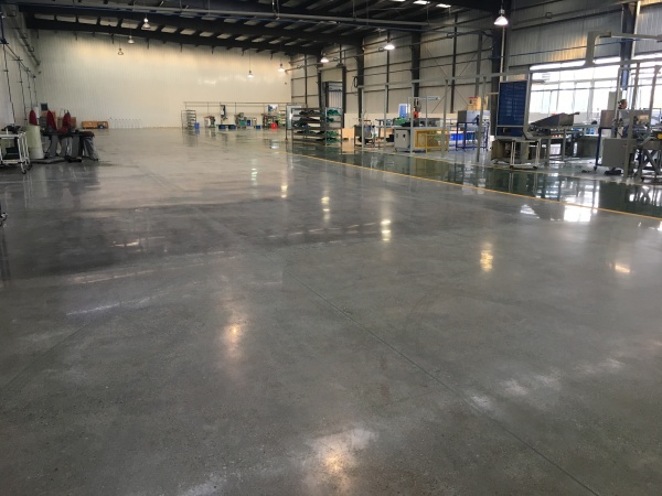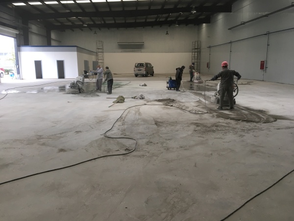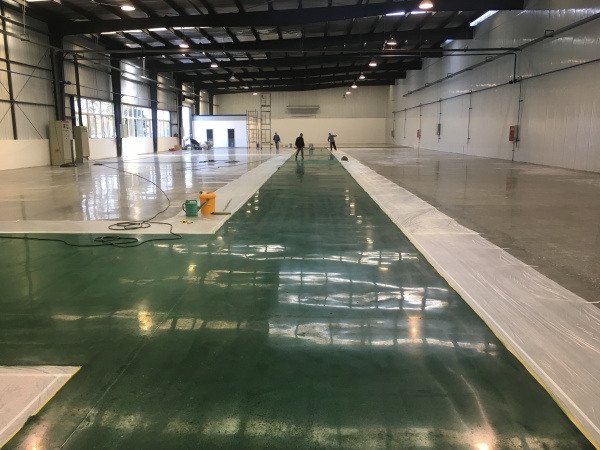 项目初期,车间地面存在起灰、磨损、污渍残留等问题,无法满足汽车生产的高耐磨、抗重载需求。我们先对原地面进行打磨、修补,通过固 化剂渗透与混凝土发生结晶反应,从内部提升地面硬度与密实度。针对车间功能分区需求,我们还在核心通道区域施工了绿色固化剂地坪,并搭配黄色标线,实现了视觉区分与耐磨防护的双重效果。