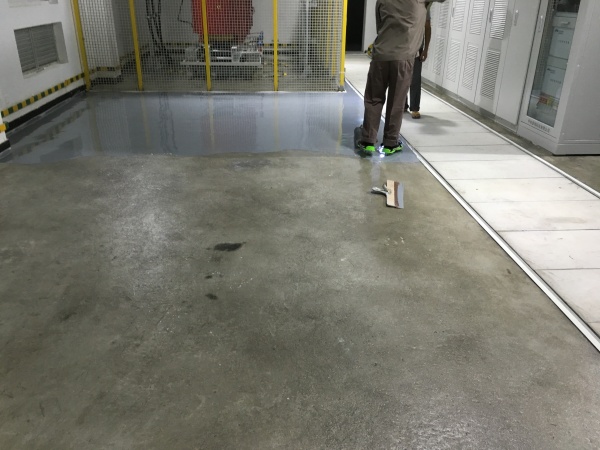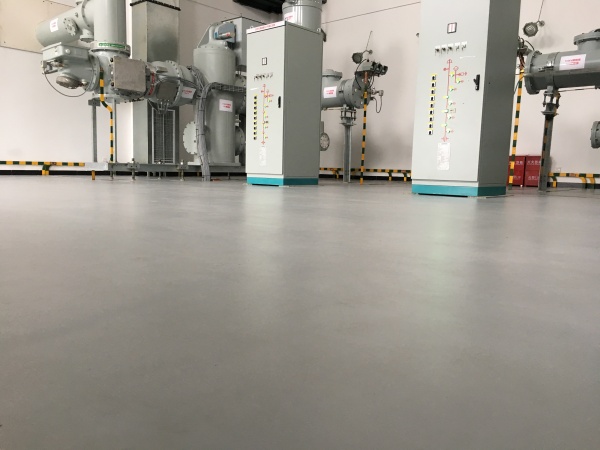施工过程中,我们严格遵循电力场所施工标准,先对基面进行彻底打磨、除尘与裂缝修补,再涂刷界面剂增强基层附着力,确保自流平材料能均匀流平、无空鼓开裂。随后浇筑水泥自流平砂浆,依靠材料自身流动性自动找平,形成高强度、高平整度的致密地面层,最终呈现出无缝、光亮、易清洁的成品效果。
